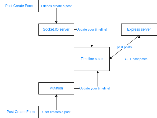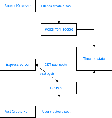 As you can see we have two sources of posts, one from the Socket.IO server and the other from the Express (opens in a new tab) server. To get the complete timeline, we need to concatenate them while keeping in mind each post’s publishing date, which could introduce bugs.